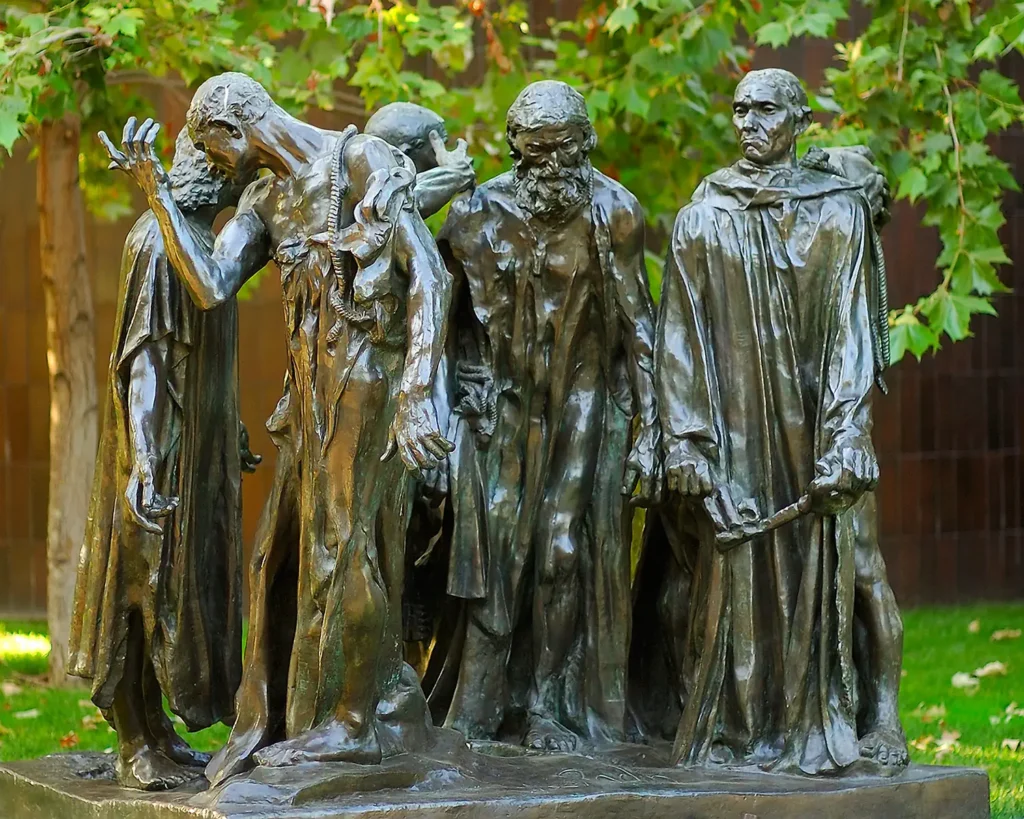 There were aesthetic rhymes with Impressionism. But in conservative Victorian fashion he still was not given to the excessive abstraction of later sculptors, although his figures often ripple with similar vitality which presaged the Impressionists. The nearly grotesque features of The Burghers of Calais or The Thinker remind one of aspects of Da Vinci’s drawn portraits, of the anatomy of Steel Age man accentuated to illustrate the tension of the era. They echo with how Impressionist painters depicted fleeting sensations rather than static forms. His sculptural pre-Impressionism visually suggests a kind of ephemerality.